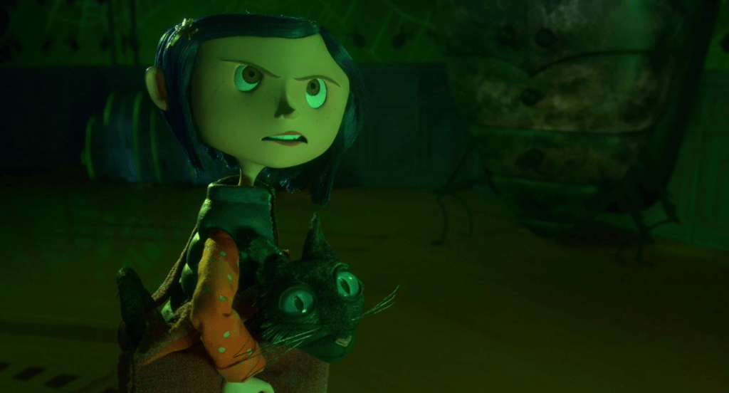 Despite his occasional sassiness, he’s pretty reasonable, as far as magical cats go, and he helps Coraline multiple times, giving her information about the world she’s walked into, the evil entity—the other mother, who looks like Coraline’s mother with buttons for eyes—she must defeat, and dropping clues on how, exactly to defeat it.