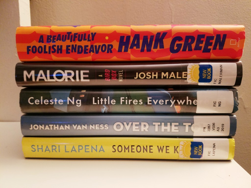 All from the library except the top one. And (unintentionally) all different genres! Sci-fi, horror, contemporary fiction (kind of an umbrella term but, more specifically, like, non-genre bestseller fiction), memoir, and thriller/mystery.